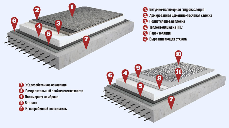 Разработан шаблон спецификации в соответствии с ГОСТ Р 21.1101-2013. Крыша с несущими железобетонными плитами с теплоизоляцией из пенополистирольных плит ППС20-Р, выравнивающей затиркой из цементно-песчаного раствора, пароизоляцией и водоизоляционным ковром. Уклонообразующий слой выполняется из цементно-песчаного раствора. Применяется в многоэтажном строительстве.