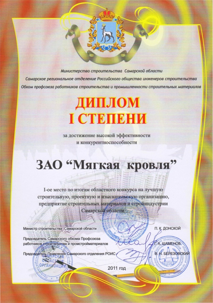 В канун Дня Строителя подведены итоги ставшего традиционным регионального конкурса на лучшую строительную, проектную, изыскательскую организацию, предприятие строительных материалов и стройиндустрии Самарской области. Завод «Мягкая кровля» занял первое место.