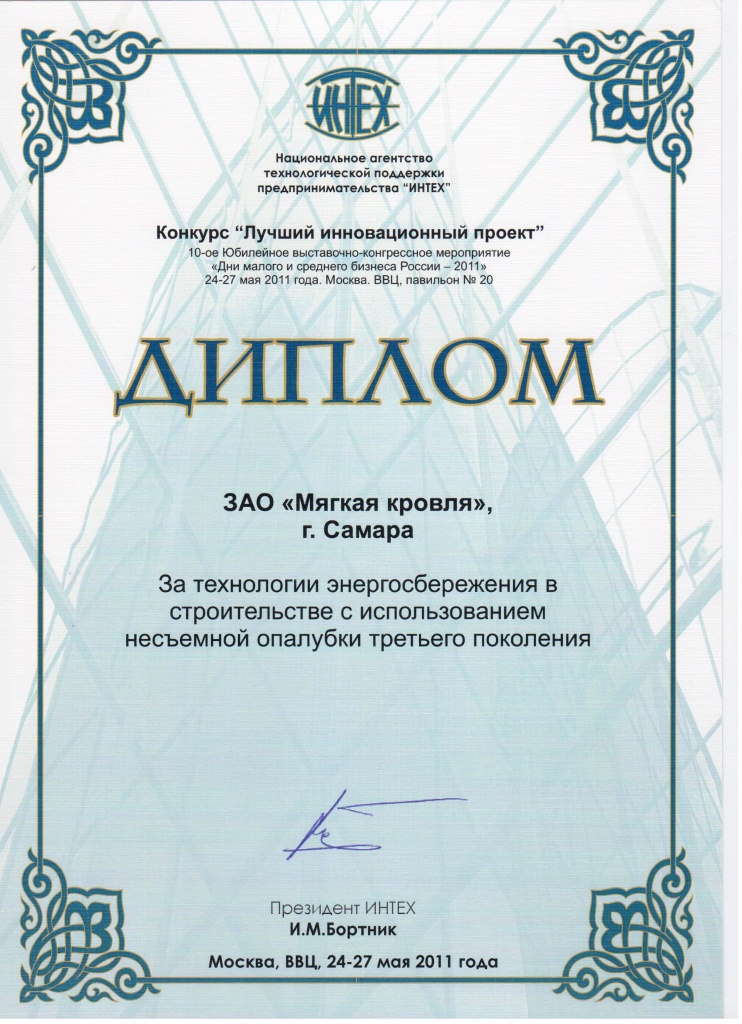 В торжественной обстановке Е.В. Шахматов вручил дипломы от ФГУ «РОСТЕСТ-МОСКВА» Росстандарта ЗАО «Мягкая кровля», которые стали лауреатами конкурсов «Лучшая продукция, оборудование и услуги» в номинации «Товары народного потребления» (за наплавляемый кровельный материал «Рубемаст») и «Лучший инновационный проект» (за технологию энергосбережения в строительстве с использованием несъемной опалубки третьего поколения).
